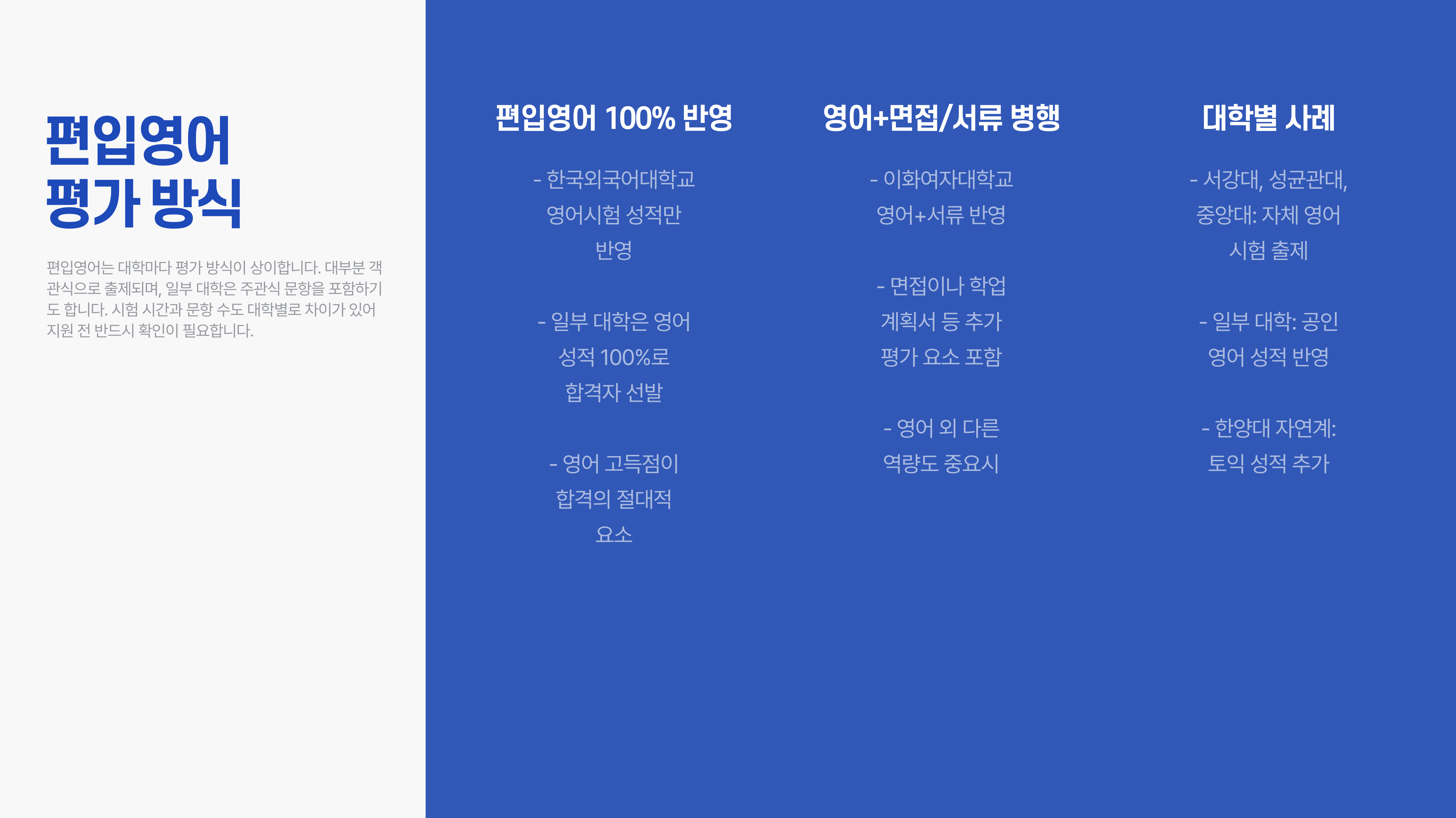 대학별로 다르지만, 대부분 편입영어 100% 또는 영어 + 면접/학업계획서 병행 방식입니다. 예를 들어 한국외국어대학교는 영어시험 성적만으로 선발하며, 이화여대는 영어 + 서류를 반영합니다.
