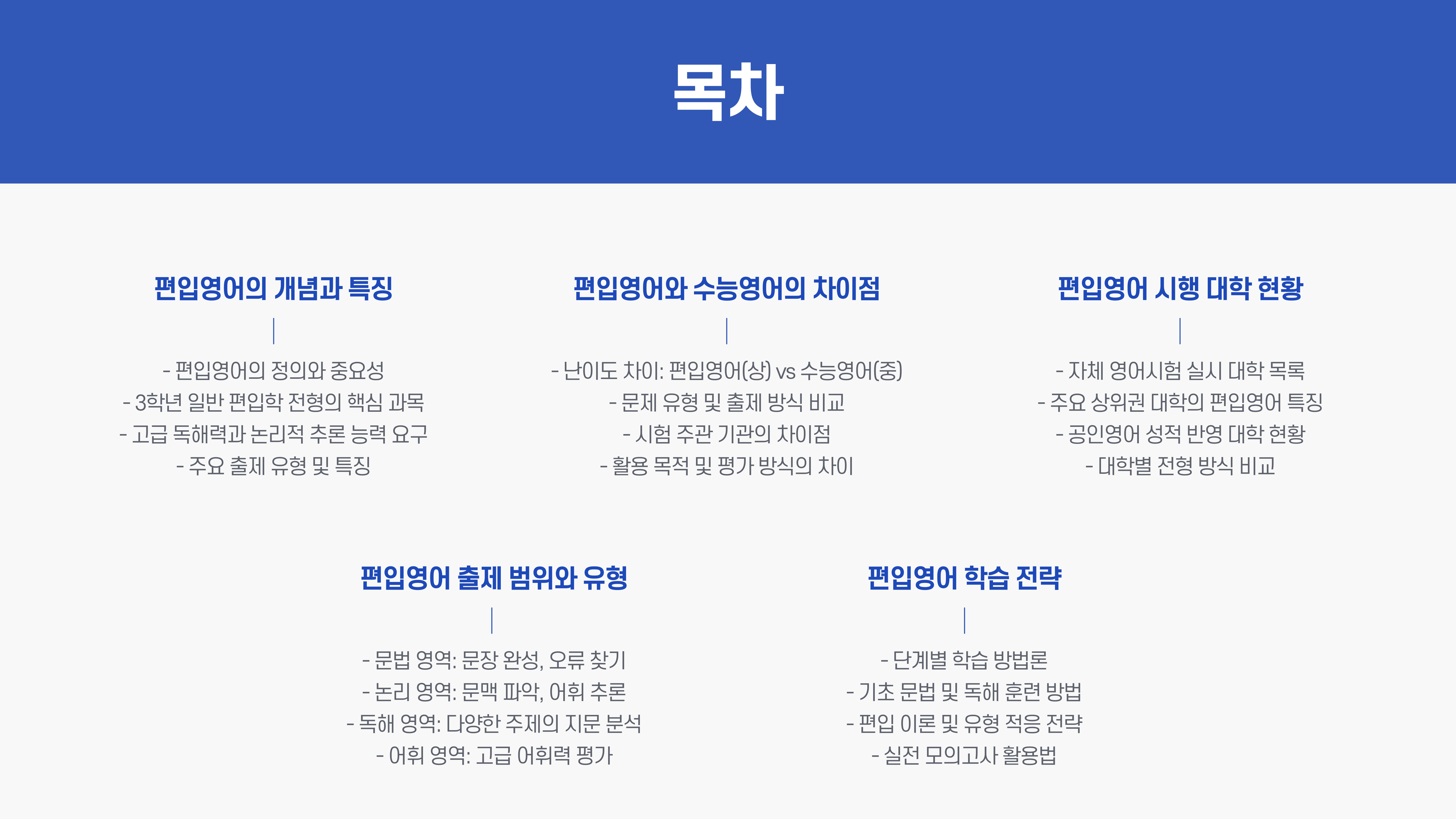 - 편입 독해 (Reading Comprehension): 제목, 목적, 요지, 글분위기, 추론, 세부내용, 내용 일치/불일치 등 객관식 문항 출제